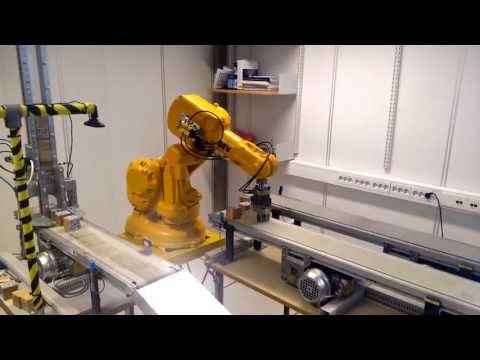 Her ser vi roboten i aksjon som pakkesorterer, med to typer klosser som flyttes til hvert sitt bånd.